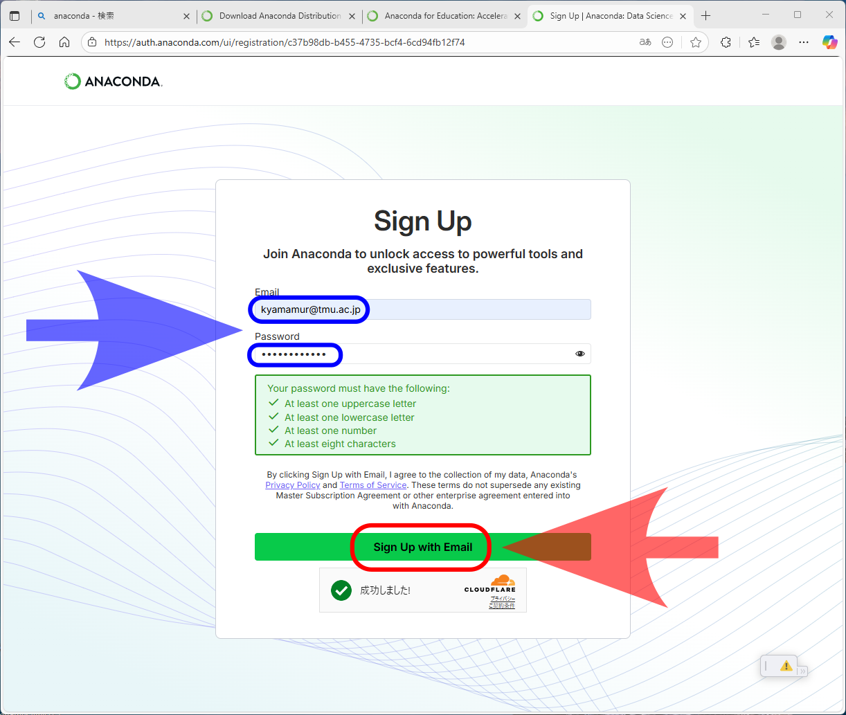 【注3】「Sign Up with Email」の下の「成功しました」が「私がボットでないことを確認します。」と表示されている場合は、左側の□(四角)をクリックし画面の指示に従い、「成功しました」と表示させること。