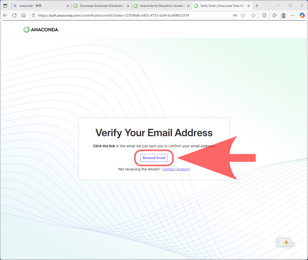 【注】メールが届くまでに時間がかかることがある。届かない場合は、ブラウザに「Verify Your Email Address」と書かれたページが表示されているはずなので、「Resend Email」をクリックしてみること。2〜3度繰り返してもよい。それでも駄目な場合は、メールアドレスの入力からやり直してみること。
