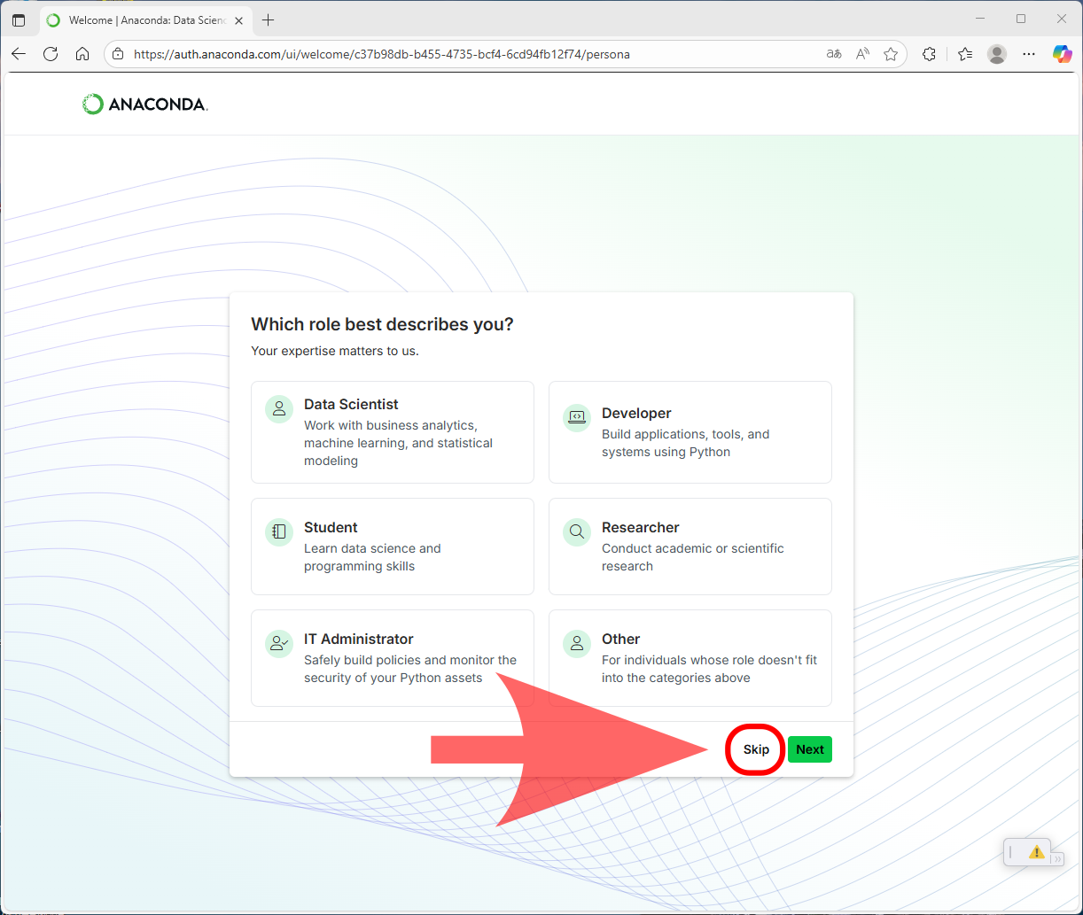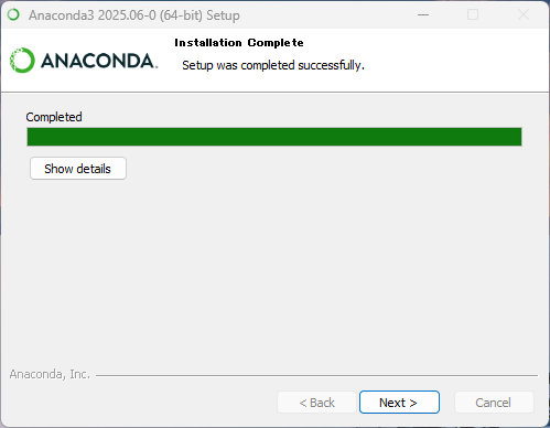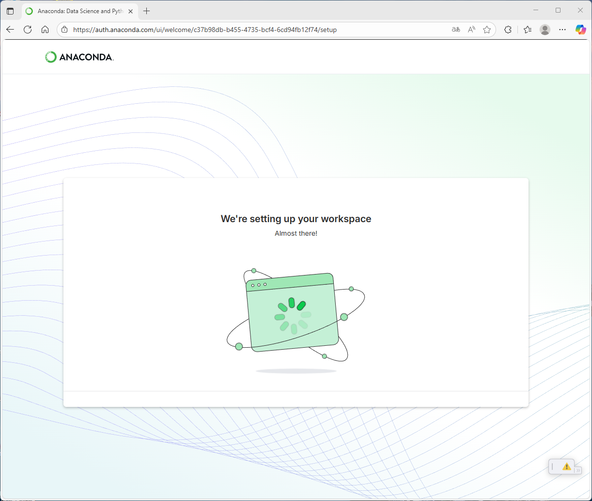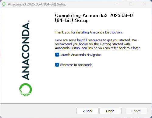 最後の画面で"Welcome to Anaconda"にチェックが入っていると、ブラウザが起動し中央に「Welcome to Anaconda!」と書いてあるページが表示される。ここでは特に読む必要はなく、閉じてよい。なお、チェックをはずしておけば表示されないので、はずしておいてもよい。また、"Launch Anaconda Navigator"のチェックははずしておくこと。チェックが入っているとインストーラの終了後、あとで説明する「ANACONDA NAVIGATOR」が起動する。起動してしまった場合は、そのままにしておいても、終了してもどちらでもよい。