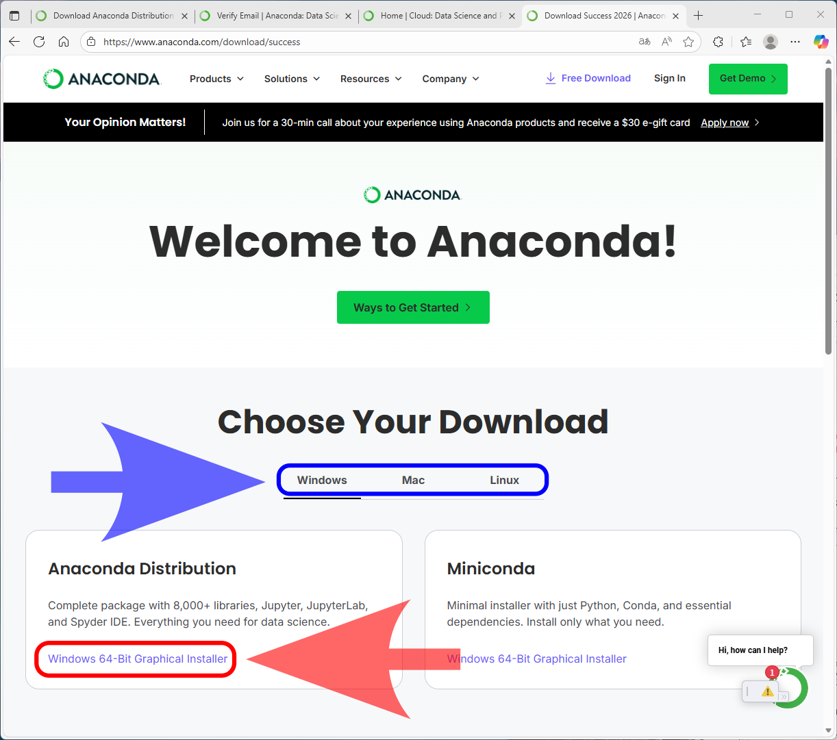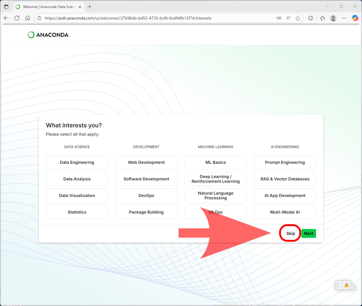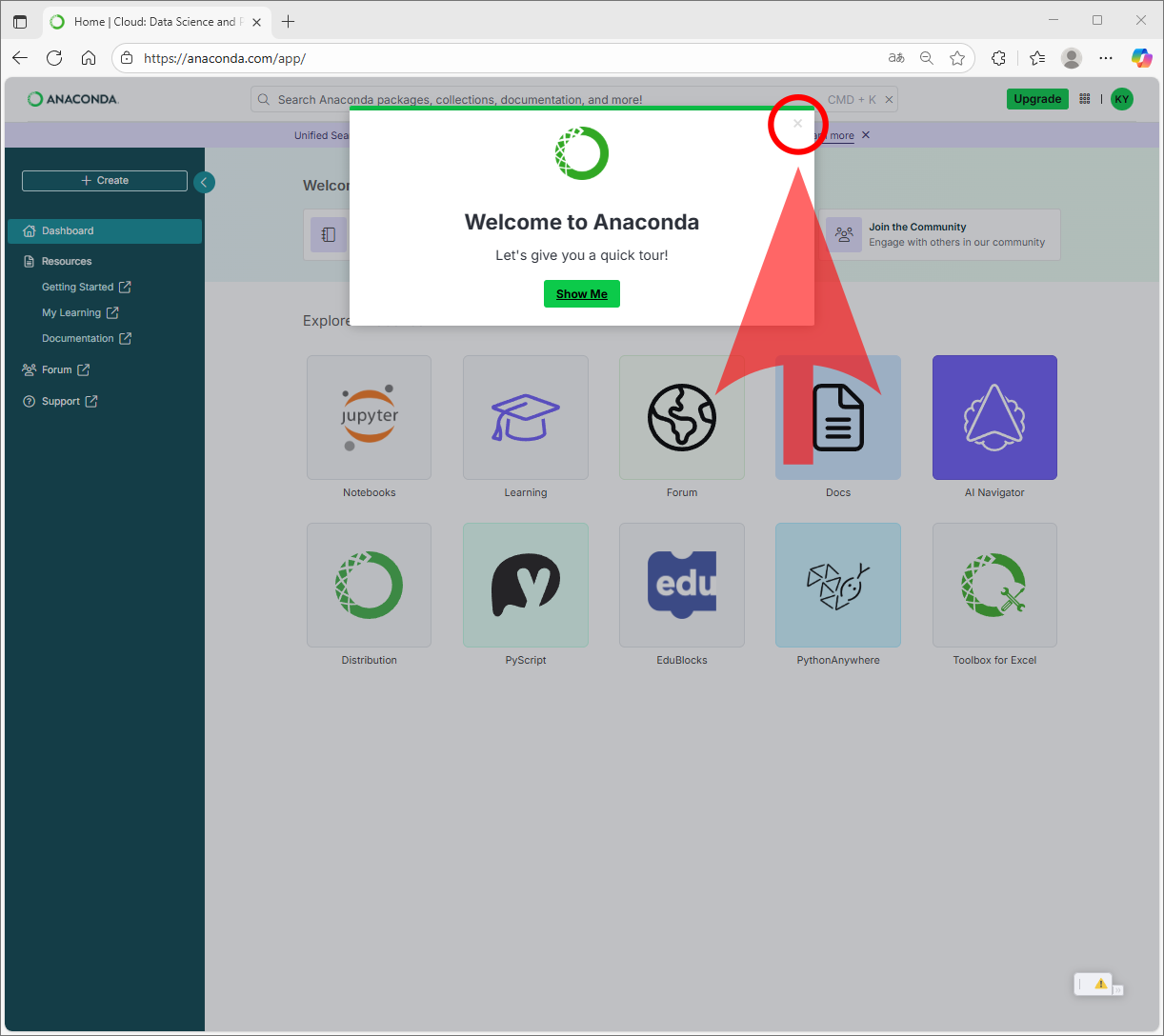 最後の画面で"Welcome to Anaconda"にチェックが入っていると、ブラウザが起動し中央に「Welcome to Anaconda!」と書いてあるページが表示される。ここでは特に読む必要はなく、閉じてよい。なお、チェックをはずしておけば表示されないので、はずしておいてもよい。また、"Launch Anaconda Navigator"のチェックははずしておくこと。チェックが入っているとインストーラの終了後、あとで説明する「ANACONDA NAVIGATOR」が起動する。起動してしまった場合は、そのままにしておいても、終了してもどちらでもよい。
