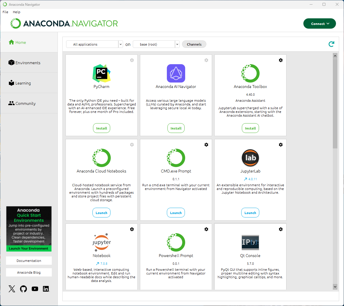 Anacondaは様々なアプリからなるパッケージである。今回の授業では使用しないが、参考までにAnaconda Navigatorのウィンドウを示しておく。 PCのメニューの「Anaconda(anaconda3)」の「Anaconda Navigator」で起動できる。