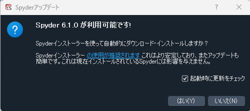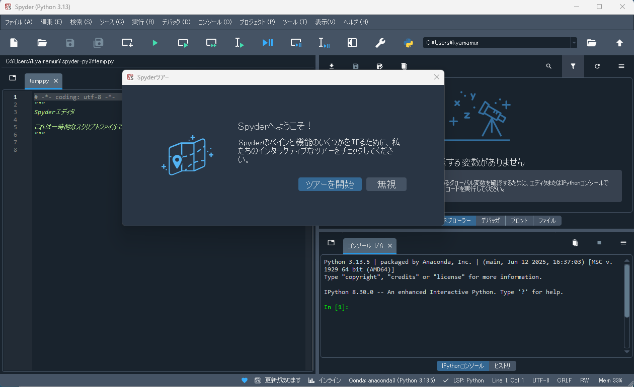 なお、ウィンドウの右下の部分(ペイン)に、"Python 3.13.5 | packaged by Anaconda, Inc......"、"In [1]:" と表示されていることを確認すること。何も表示されていなければインストールを失敗している可能性が高い。
