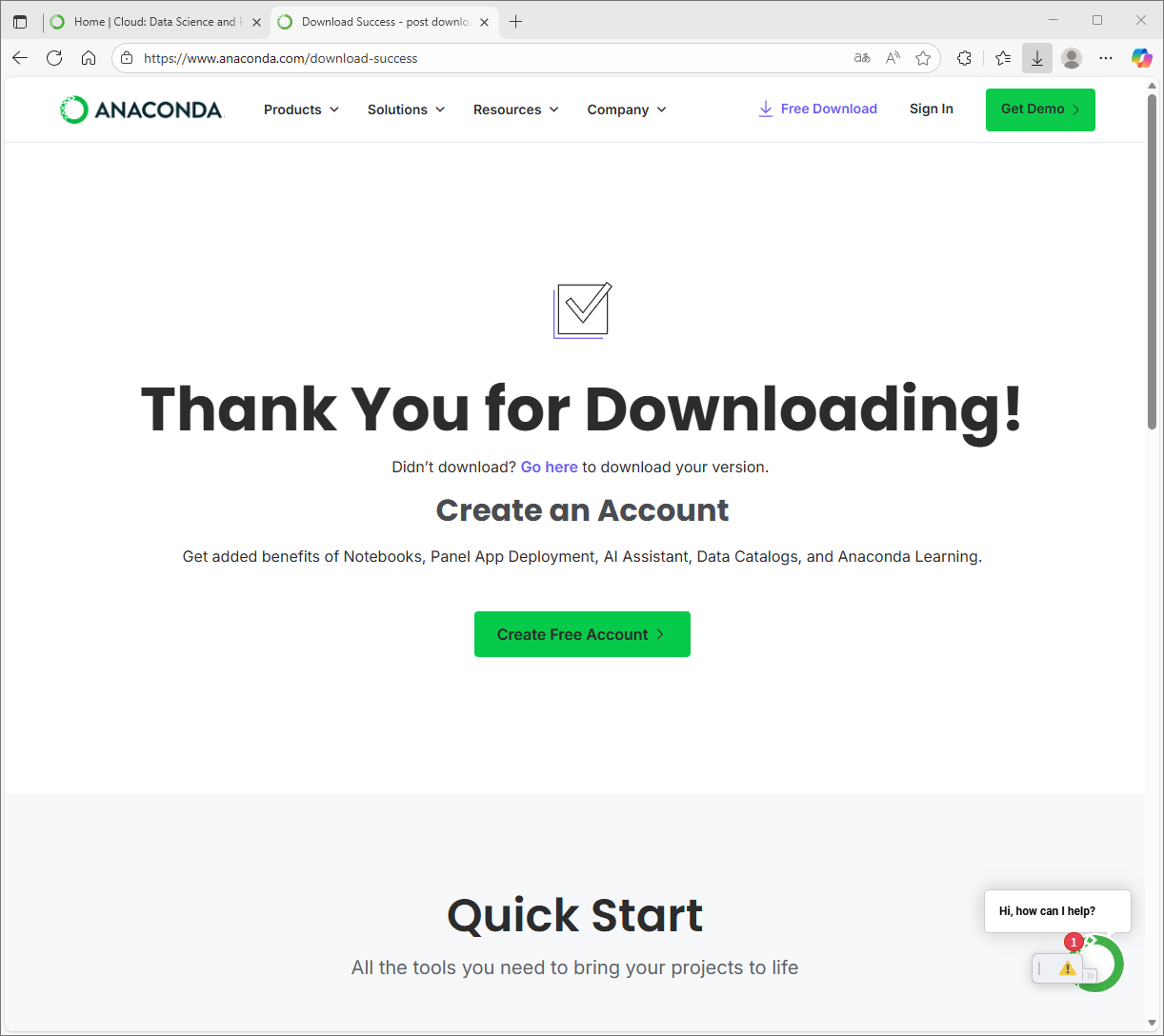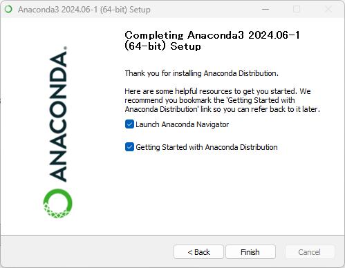 最後の画面で下の項目にチェックが入っていると、ブラウザが起動し中央に「Welcome to Anaconda!」と書いてあるページが表示される。ここでは特に読む必要はなく、閉じてよい。なお、チェックをはずしておけば表示されないので、はずしておいてもよい。また、上の項目のチェックははずしておくこと。チェックが入っているとインストーラの終了後、次項で説明する「ANACONDA NAVIGATOR」が起動する。起動してしまった場合は、そのまま次項に進めばよい。