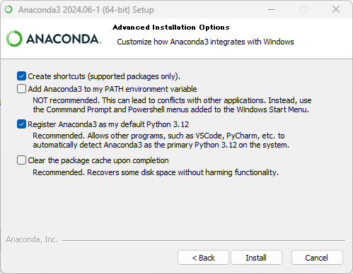 5番目の「Advanced Installation Options」の画面で、チェックボックスにチェックされているものがあるが、授業以外でpythonを使う予定が無ければ、はずすことを推奨する。