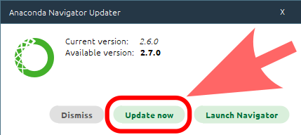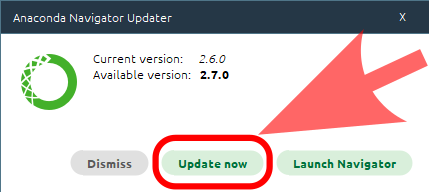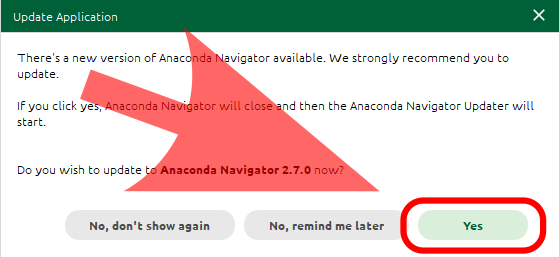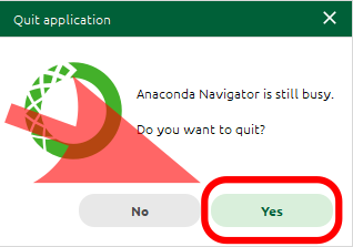 - アップデートのためAnaconda Navigatorを終了するか尋ねられるので、一旦終了する。