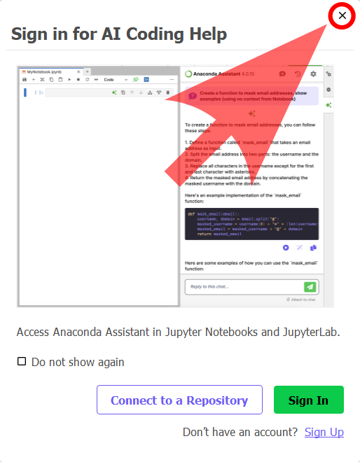 - 「Sign in for AI Coding Help」と表示されたウィンドウがポップアップするが、この授業では使わないので「×」をクリックする。