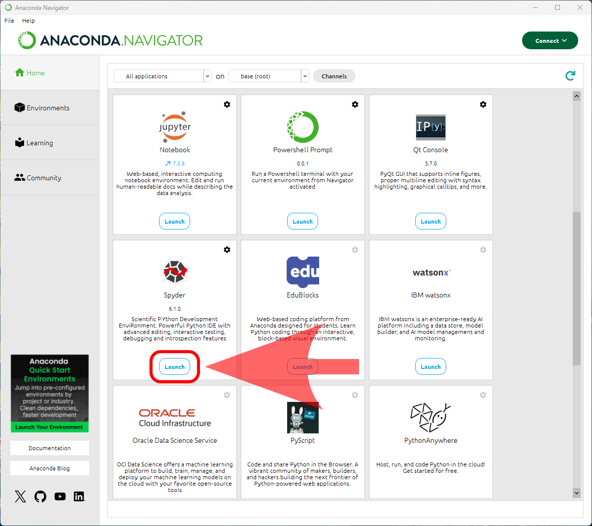- 必要に応じてスクロールし、Spyderを起動するための「Launch」をクリックする。