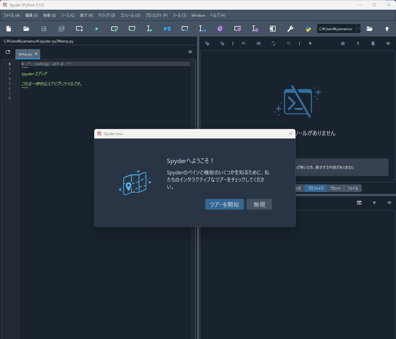 - Sypderのロゴが表示され、下のような画面となればインストールは完了である。初めて起動したとき「Spyderへようこそ!」(Spyderの機能の説明)のウィンドウが表示される(中央の画像)。いつでも「ヘルプ→Interactive tour」で見ることができるのでここでは「無視」をクリックする。